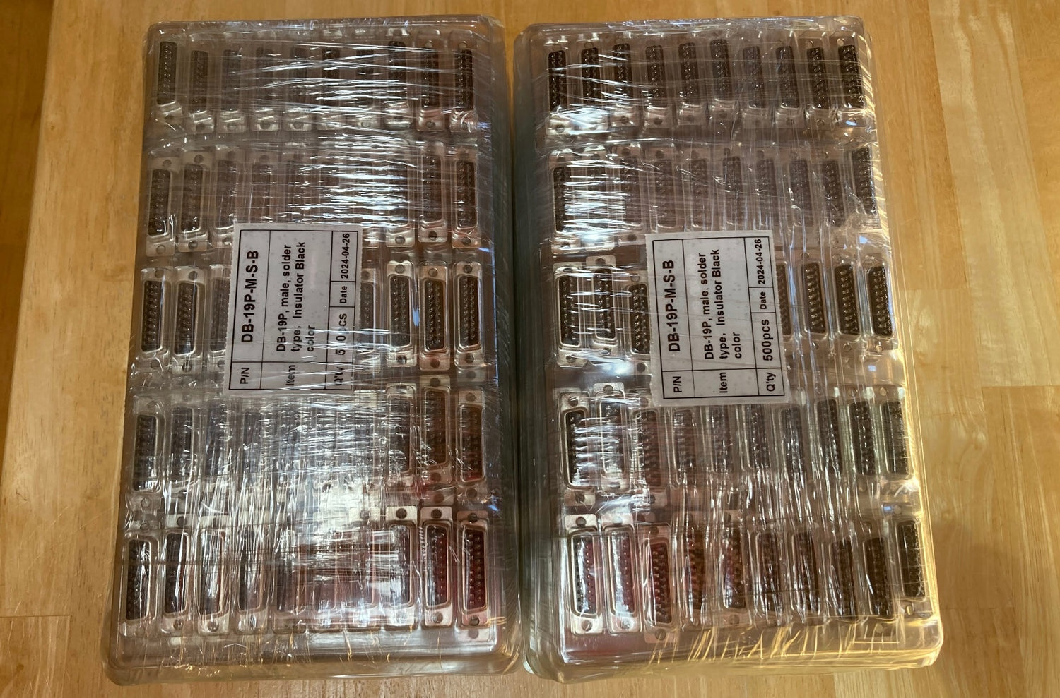 This is a bulk lot of 1000 pieces. The connectors are DB-19 male, with solder cup terminals, solder type connector, sometimes called DB-19P. They are first quality, with an all-metal shell, not something 3D-printed or hand-built. It’s the connector itself (it does not have a shroud), and they can be used for making cables, or can also be edge-mounted on a 1.2mm or 1.6mm thick PCB. A footprint file for edge-mounting is available upon request. They are packaged in plastic trays of 50 pieces each, with 20 trays (1000 pieces) per box.